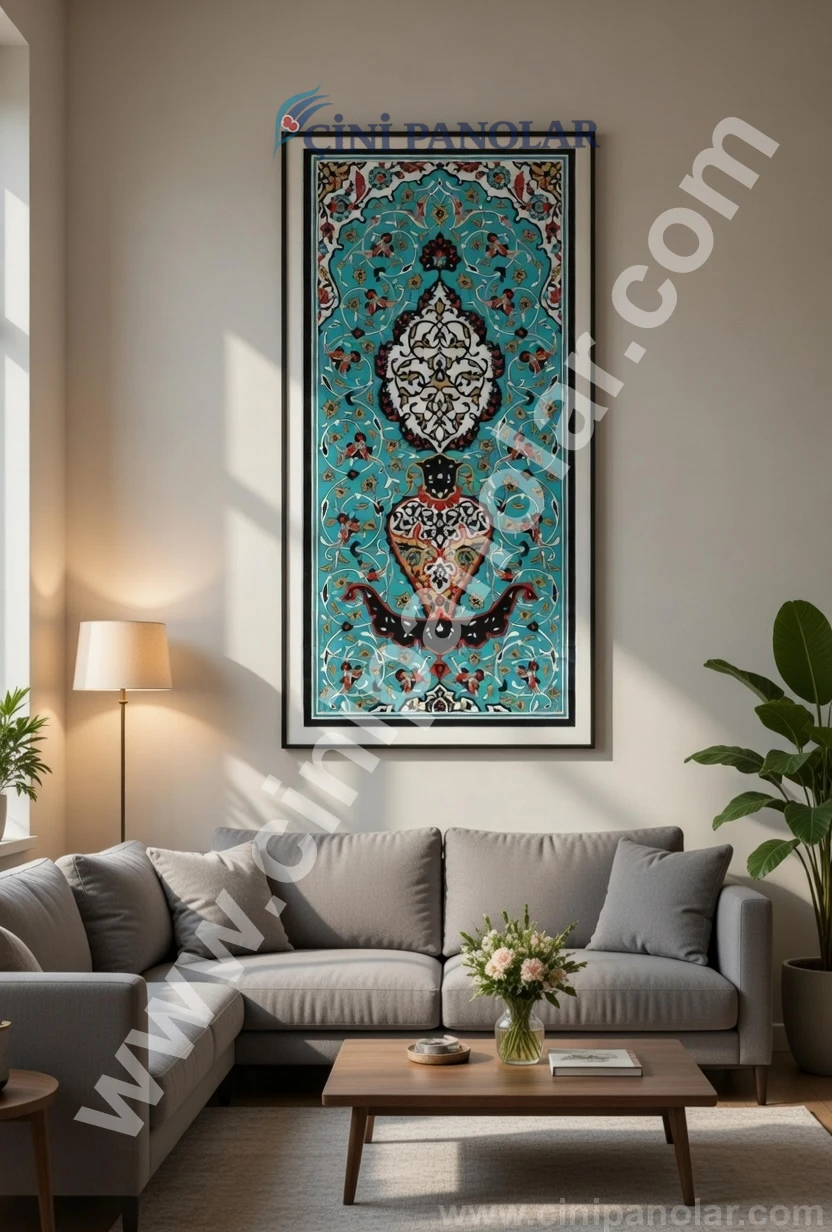 Turkuaz tonlarının hakim olduğu bu tasarım, İznik çini sanatının karakteristik renklerinden birini modern dekorasyonla bir araya getirir. Bu sayede çini tablo bulunduğu mekânda dikkat çeken sanatsal bir odak noktası oluşturur.