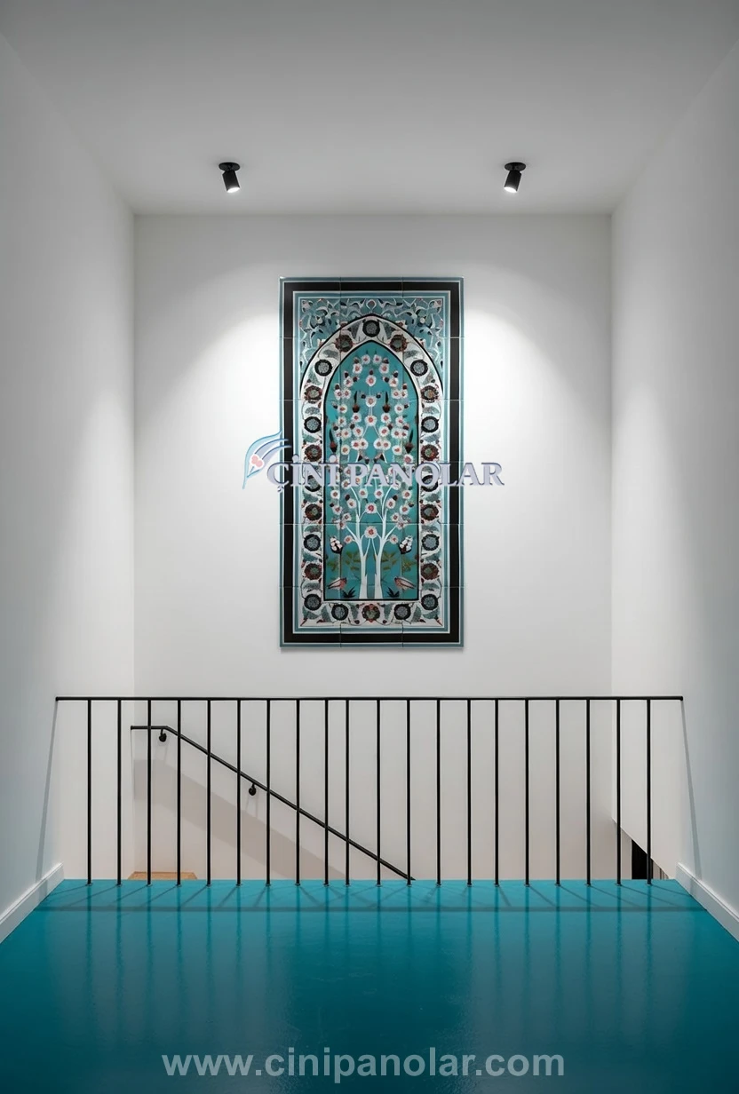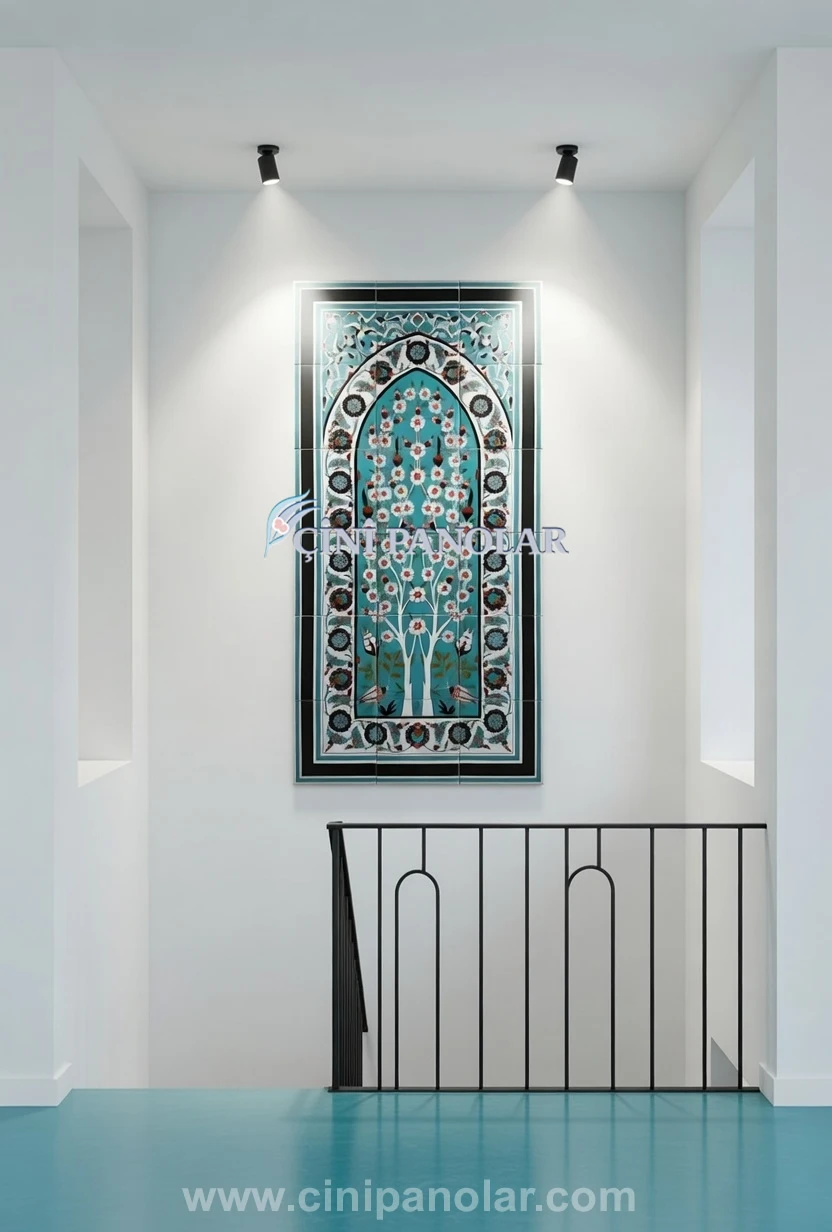 Turkuaz tonlarının hakim olduğu bu özel tasarım, iznik çini sanatının karakteristik renklerini modern dekorasyonla bir araya getirir. Bu sayede çini tablo bulunduğu mekânda dikkat çeken sanatsal bir odak noktası oluşturur.